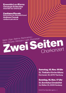 Zwei Seiten – Konzert mit zwei Chören Im November tritt das Vokalensemble Lux Aeterna unter der…